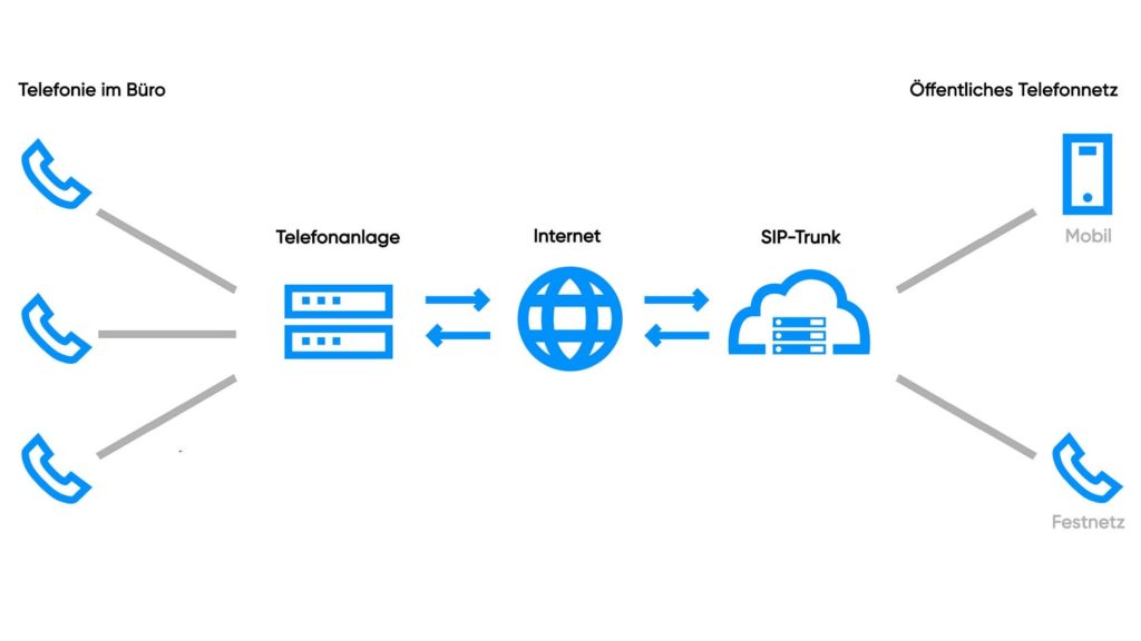 SIP ist die Abkürzung für „Session Initiation Protocol“. Das sind die Regeln, nach denen sich Endgeräte und Vermittlungsstellen über den Auf- und Abbau von Telefongesprächen verständigen. Und Trunk kann man sich als „Bündel“ vorstellen, dass mehrere Signale und Sprachdaten sammelt, um eine komplette VoIP-Anlage über einen Internetanschluss anzubinden.